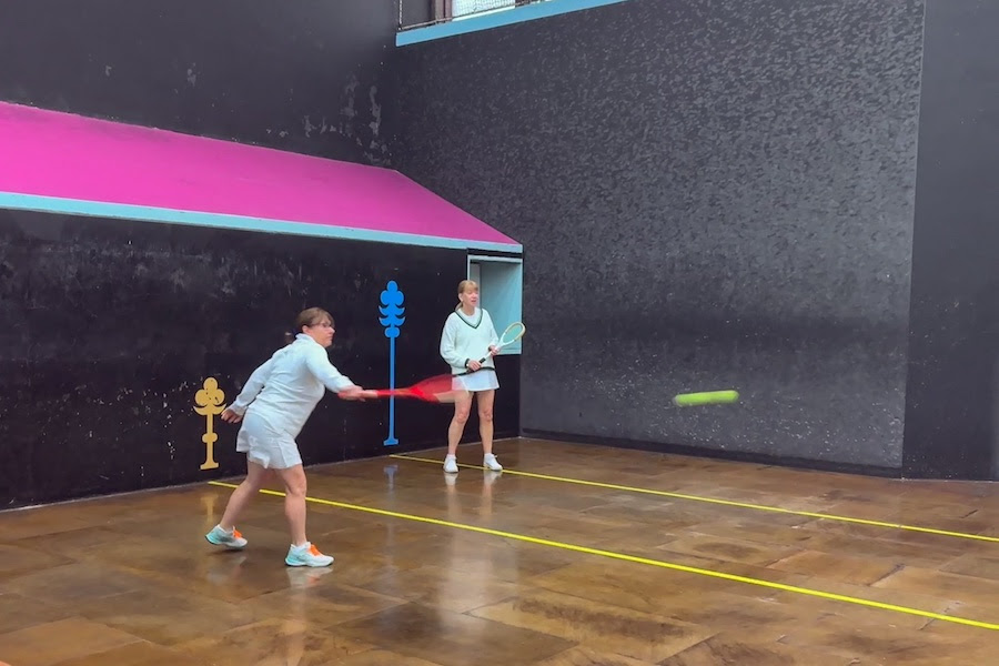 Two pairs stood out as possible finalists, Erin Hartman/Zoe Neville and Olivia Jacobs/Clemmie Willmott. These two pairs played each other first in the group. Olivia began serving to Zoe and immediately produced an impressive railroad, followed by a strong forehand into the base of the tambour. Zoe began to read Olivia’s serve and also produced some strong forehands of her own, however, Olivia and Clemmie managed to not concede any chases. At deuce, Zoe hit a return into the dedans making it their advantage, however, it was Olivia and Clemmie who kept their composure to win the first game with a volley by Olivia under the grille which Erin could not return. The next game went to Erin and Zoe to make it 1-1. It was not until the third game that a chase was laid. Erin and Zoe then took control of this match with Erin and Zoe’s strong and varied serving and impressive groundstrokes. They went onto win the match 5-2. Olivia and Clemmie stayed on to play Lucie and Paloma and won 5-0. Next on were Alice and Arabella (Bells) vs Lucie and Paloma and this time it was Lucie and Paloma’s turn to win 5-0. Alice and Bells then played Bonnie Tindall and Ashleen Gill and lost 5-1. Bonnie and Ashleen stayed on to play Erin and Zoe with the latter pair proving too strong and winning 5-0. It was the same score in Erin and Zoe’s next match against Lucie and Paloma. Lucie and Paloma stayed on to play Bonnie and Ashleen. This was a much closer match with the latter pair showing more confidence and hitting the ball better but nonetheless losing 5-3. The remaining group matches saw Olivia and Clemmie proving too strong for Bonnie and Ashleen 5-1, and then again against Alice and Bells 5-0, with the remaining group match being won by Erin and Zoe 5-0 against Alice and Bells.