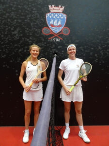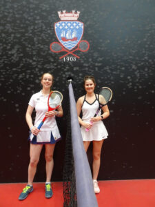 Two pairs stood out as possible finalists, Erin Hartman/Zoe Neville and Olivia Jacobs/Clemmie Willmott. These two pairs played each other first in the group. Olivia began serving to Zoe and immediately produced an impressive railroad, followed by a strong forehand into the base of the tambour. Zoe began to read Olivia’s serve and also produced some strong forehands of her own, however, Olivia and Clemmie managed to not concede any chases. At deuce, Zoe hit a return into the dedans making it their advantage, however, it was Olivia and Clemmie who kept their composure to win the first game with a volley by Olivia under the grille which Erin could not return. The next game went to Erin and Zoe to make it 1-1. It was not until the third game that a chase was laid. Erin and Zoe then took control of this match with Erin and Zoe’s strong and varied serving and impressive groundstrokes. They went onto win the match 5-2. Olivia and Clemmie stayed on to play Lucie and Paloma and won 5-0. Next on were Alice and Arabella (Bells) vs Lucie and Paloma and this time it was Lucie and Paloma’s turn to win 5-0. Alice and Bells then played Bonnie Tindall and Ashleen Gill and lost 5-1. Bonnie and Ashleen stayed on to play Erin and Zoe with the latter pair proving too strong and winning 5-0. It was the same score in Erin and Zoe’s next match against Lucie and Paloma. Lucie and Paloma stayed on to play Bonnie and Ashleen. This was a much closer match with the latter pair showing more confidence and hitting the ball better but nonetheless losing 5-3. The remaining group matches saw Olivia and Clemmie proving too strong for Bonnie and Ashleen 5-1, and then again against Alice and Bells 5-0, with the remaining group match being won by Erin and Zoe 5-0 against Alice and Bells.