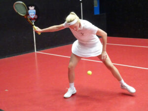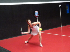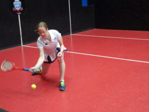 In the U19 National Schools competition matches are played in groups starting with the highest handicap group playing first, and on this occasion both the winner and runner–up were being allowed to go through into the next group. Matches were played off level. Our first match saw Tabs Bridgeman v Honor Pennant both of Wellington College. Tabs raced to a 3-0 lead, but Honor managed to get back 2–3. Some lengthy rallies were played but Tabs just had that much greater control on her groundstrokes, in addition, hit some excellent length bobble serves. Tabs stayed on court to play Bonnie Tindall (Godolphin and Latymer). Both players were solid volleyers. It was a close encounter until 2–2 then Tabs surged away with continued accurate serves and good use of the side walls on difficult shots to win 8–2. Our final group match was Honor v Bonnie. This match went 1–1, 2–2, 3–3, etc right through to 7–7. In the end, Honor took the final game. Both players had improved as the game went on and the rallies became longer with Honor hitting some lovely volleys and Bonnie becoming stronger at returning Honor’s difficult serve. Honor should have gone through as runner– up of the group, however, fortunately, from Bonnie’s point of view, it was Honor’s 18th birthday, and she had other pressing engagements to go to, so we let Bonnie go through into the next group.